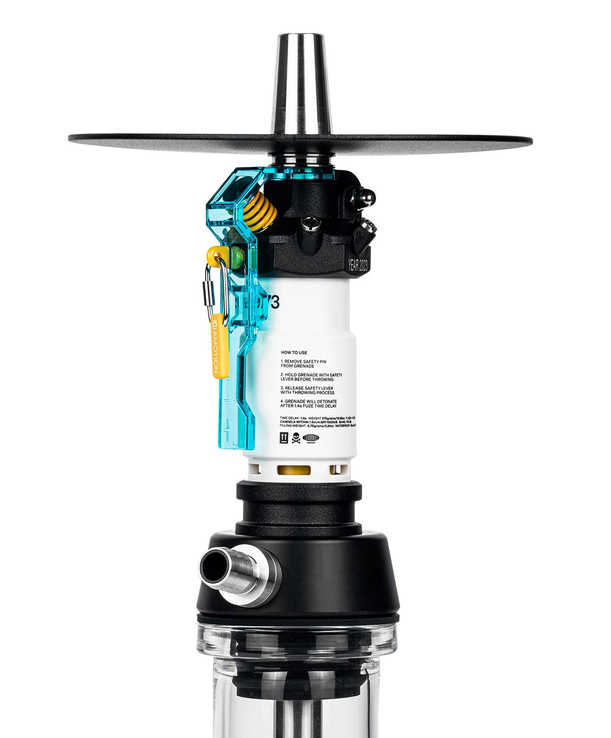 With over 30 individual parts, the Flash Bang is one of the most complex and detailed shishas ever. The design was based on a futuristic stun grenade and gave it something unusual. But that is not all.